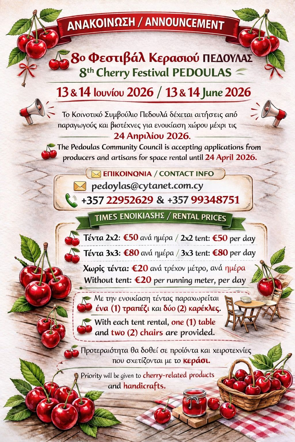The festival is organized by the Pedoulas Community Council and the Association of Pedoulas Emigrants and Friends.