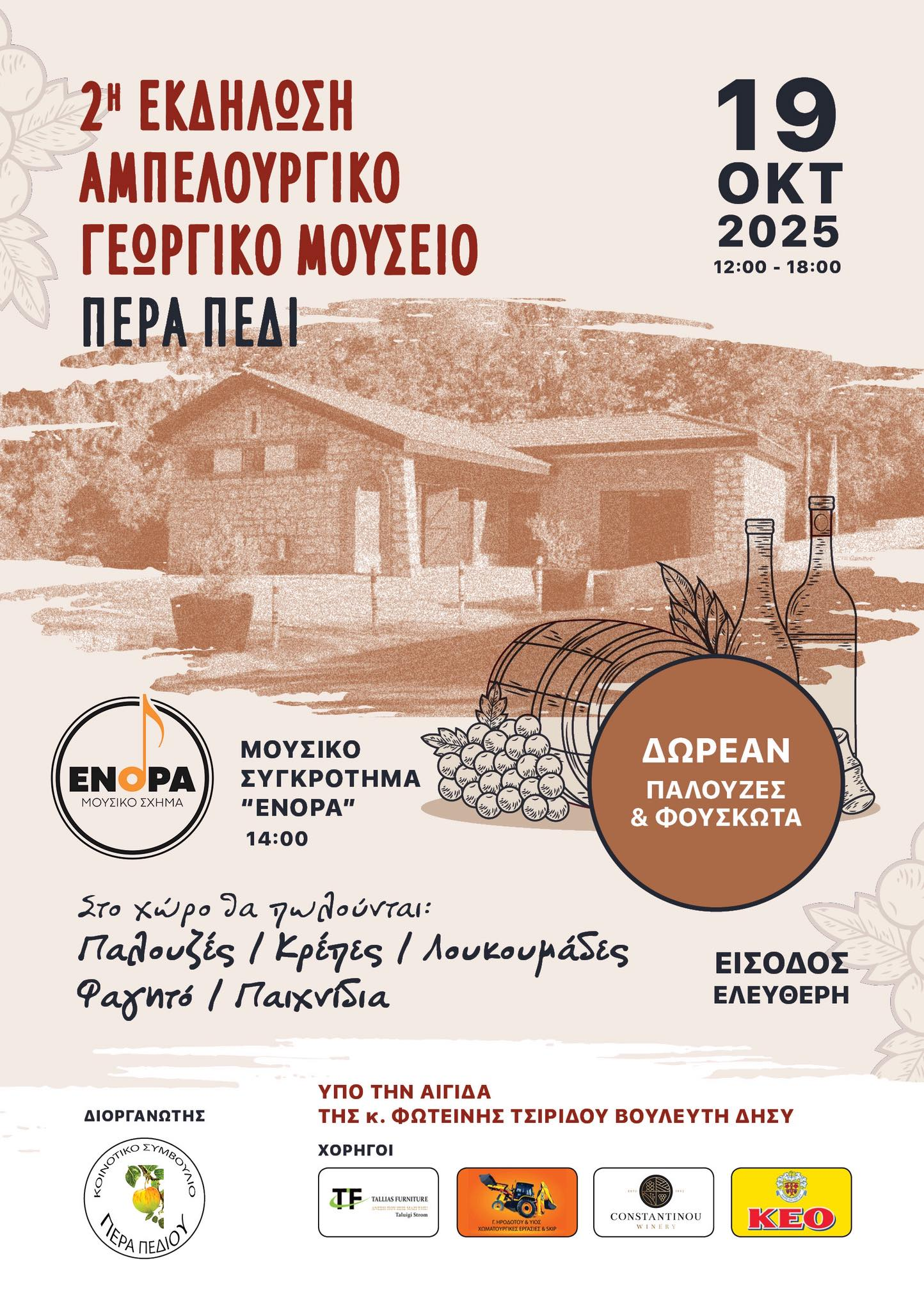 Η Κοινότητα Πέρα Πεδί ετοιμάζει τη διοργάνωση της 2ης εκδήλωσης του Αμπελουργικού Γεωργικού Μουσείου, η οποία θα πραγματοποιηθεί την Κυριακή 19 Οκτωβρίου 2025 στο Πέρα Πεδί.