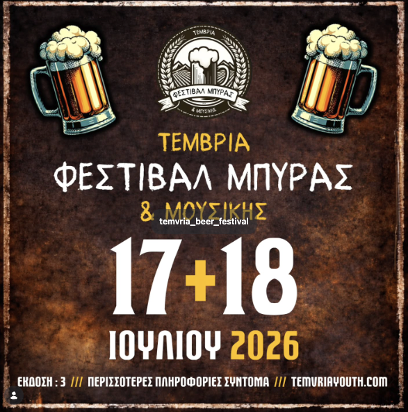 Η Νεολαία Τεμβριάς ανακοίνωσε ότι το 3ο φεστιβάλ μπύρας και μουσικής στην Τεμβριά θα πραγματοποιηθεί το σιήμερο 17+18 Ιουλίου 2026.. κι εμείς ανυπομονούμε ήδη.