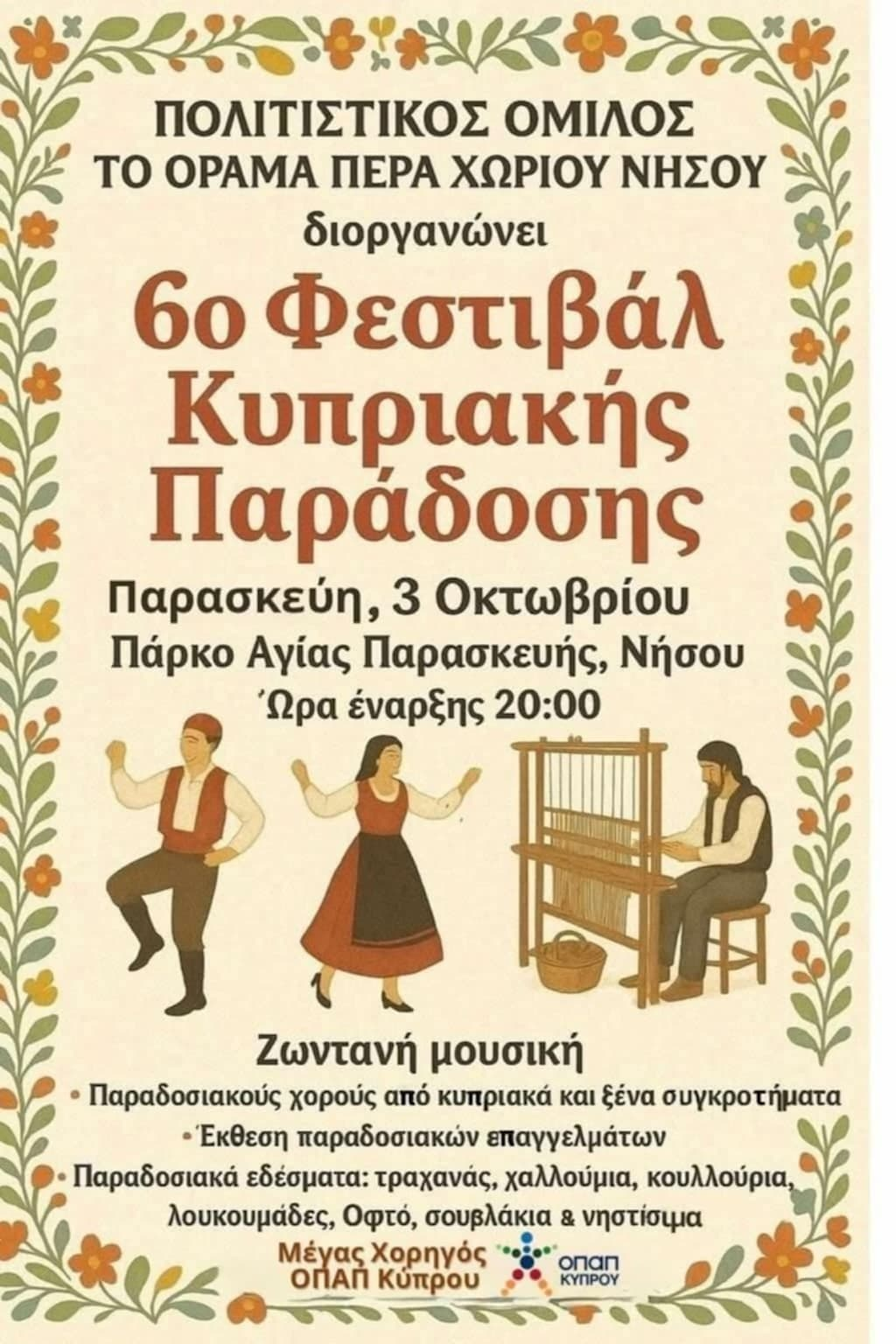 Ο Πολιτιστικός Όμιλος 'Το Όραμα' διοργανώνει την Παρασκευή 3 Οκτωβρίου, στις 20:00 μ.μ., στο Κοινοτικό Πάρκο Αγίας Παρασκευής στη Νήσο, μια γιορτή που τιμά την κυπριακή παράδοση.
