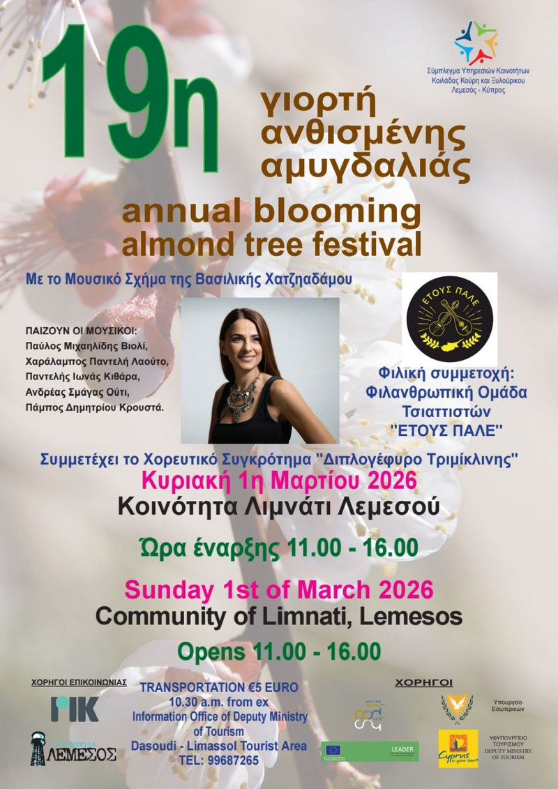 Γι' αυτό λοιπόν και η Κοινότητα Λιμνάτι Λεμεσού με χαρά μας προσκαλεί και πάλι στην 19η Γιορτή Ανθισμένης Αμυγδαλιάς που θα παραγματοποιηθεί φέτος την Κυριακή 1η Μαρτίου 2026 από τις 11.00 - 16.00.