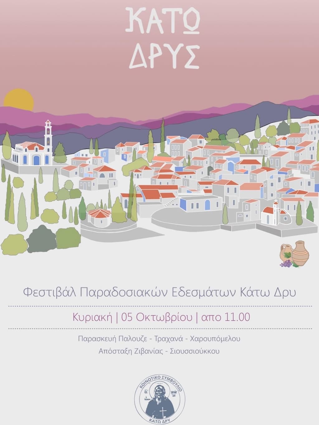 Ο Κάτω Δρυς διοργανώνει την Κυριακή 5 Οκτωβρίου Φεστιβάλ Παραδοσιακών Εδεσμάτων. Στο χωριό διοργανώνεται ένα γευστικό φεστιβάλ αφιερωμένο στα παραδοσιακά μας εδέσματα, τα οποία θα έχεις τη δυνατότητα να δοκιμάσεις.