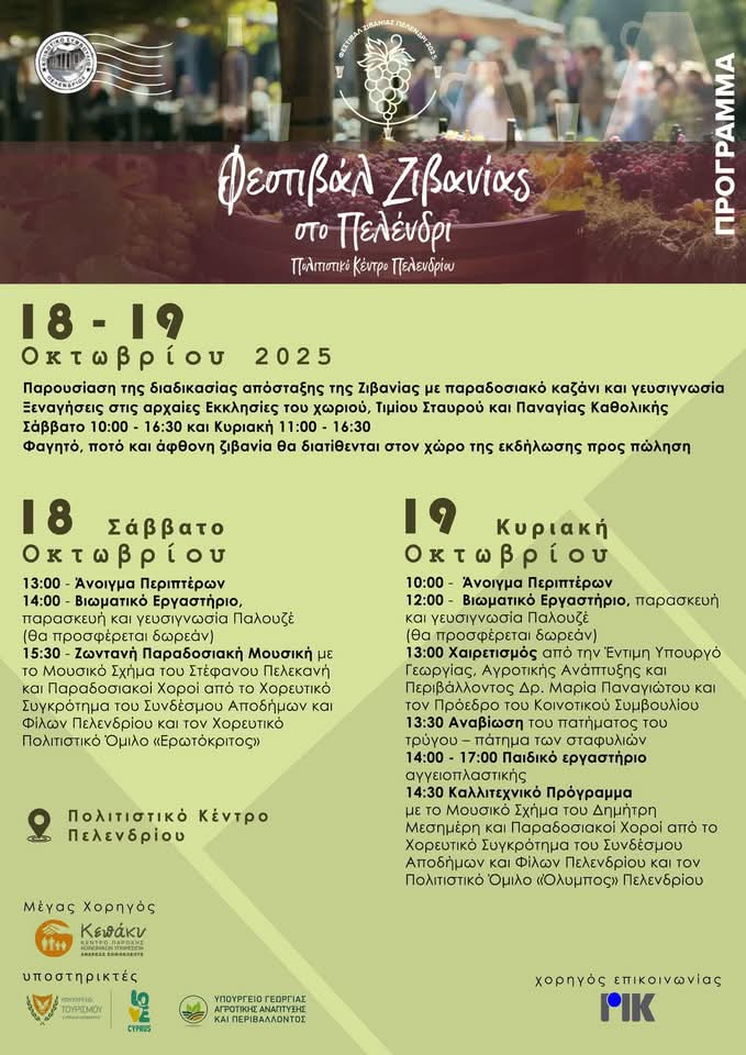 Το Πελένδρι ανακοίνωσε και την ημερομηνία για τη διήμερη γιορτή του, που φέτος θα πραγματοποιηθεί νωρίτερα, μέσα στον Οκτώβριο. Το Φεστιβάλ Ζιβανίας στο Πελένδρι θα λάβει χώρα το σαββατοκύριακο 18 & 19 Οκτωβρίου, και θα περιλαμβάνει χορούς και τραγούδια, παζαράκι, αναβίωση του τρύγου και πάτημα σταφυλιών κ.ά.