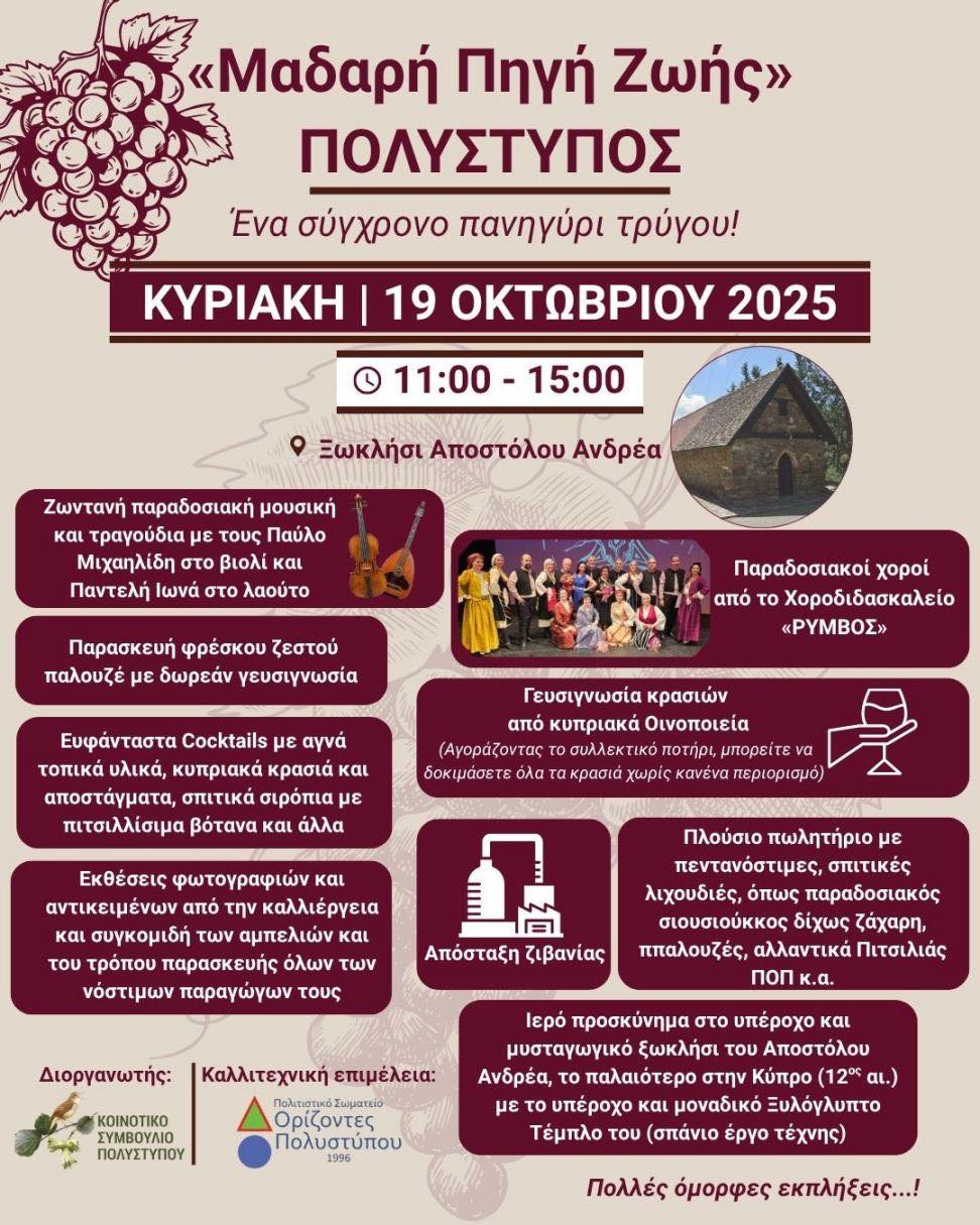 Στις 19 Οκτωβρίου, το γραφικό χωριό, ένα από τα ψηλότερα της Κύπρου, θα φορέσει τα γιορτινά του για ένα σύγχρονο πανηγύρι του τρύγου, γεμάτο γεύσεις, παράδοση και αυθεντική φιλοξενία.