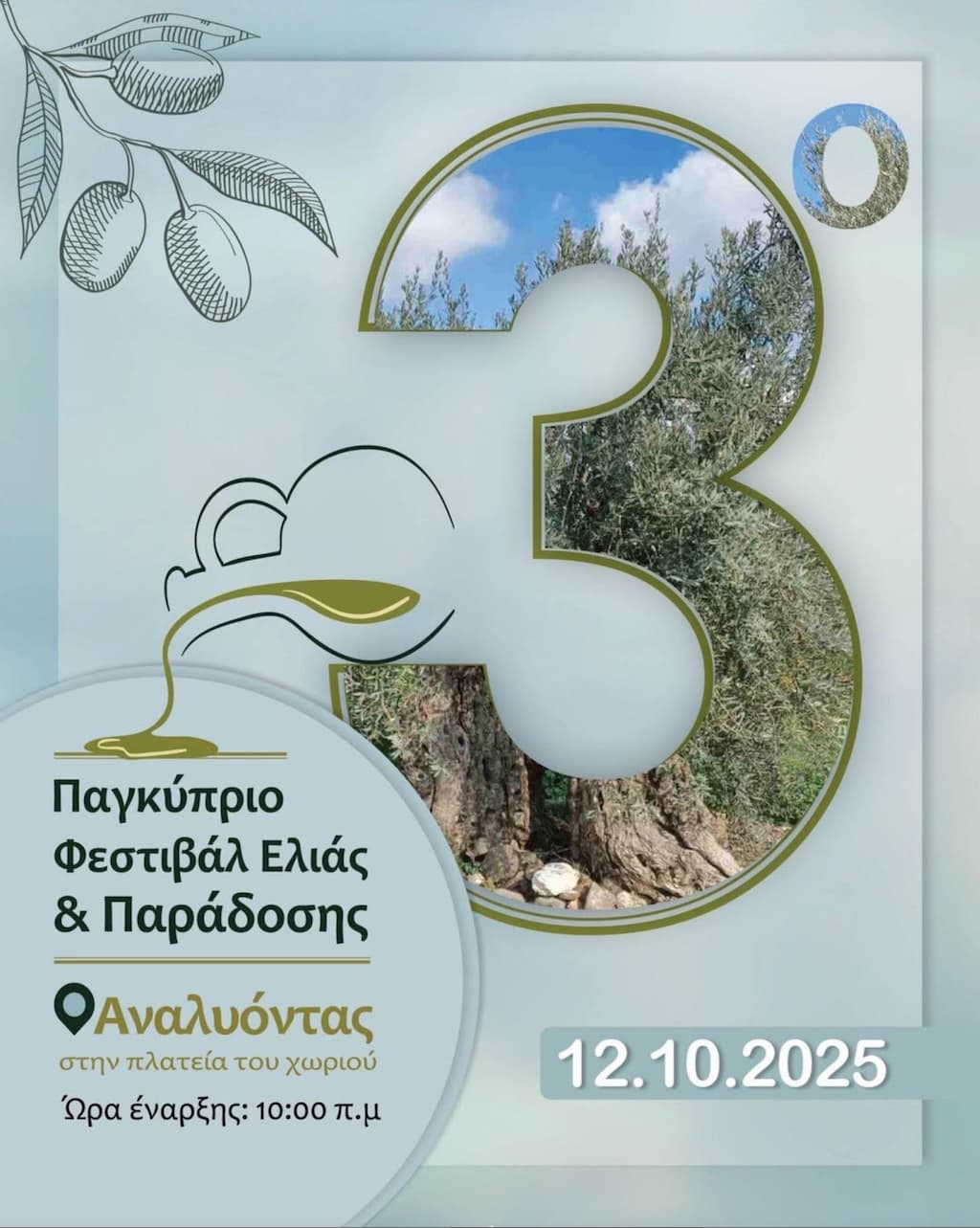 Το Κοινοτικό Συμβούλιο Αναλυόντα ανακοινώνει τη διοργάνωση του 3ου Παγκύπριου Φεστιβάλ Ελιάς και Παράδοσης, που θα πραγματοποιηθεί την Κυριακή 12 Οκτωβρίου 2025, στην Κοινότητα Αναλυόντα. Μια γιορτή αφιερωμένη στην ελιά, την παράδοση και τον πολιτισμό του τόπου μας.