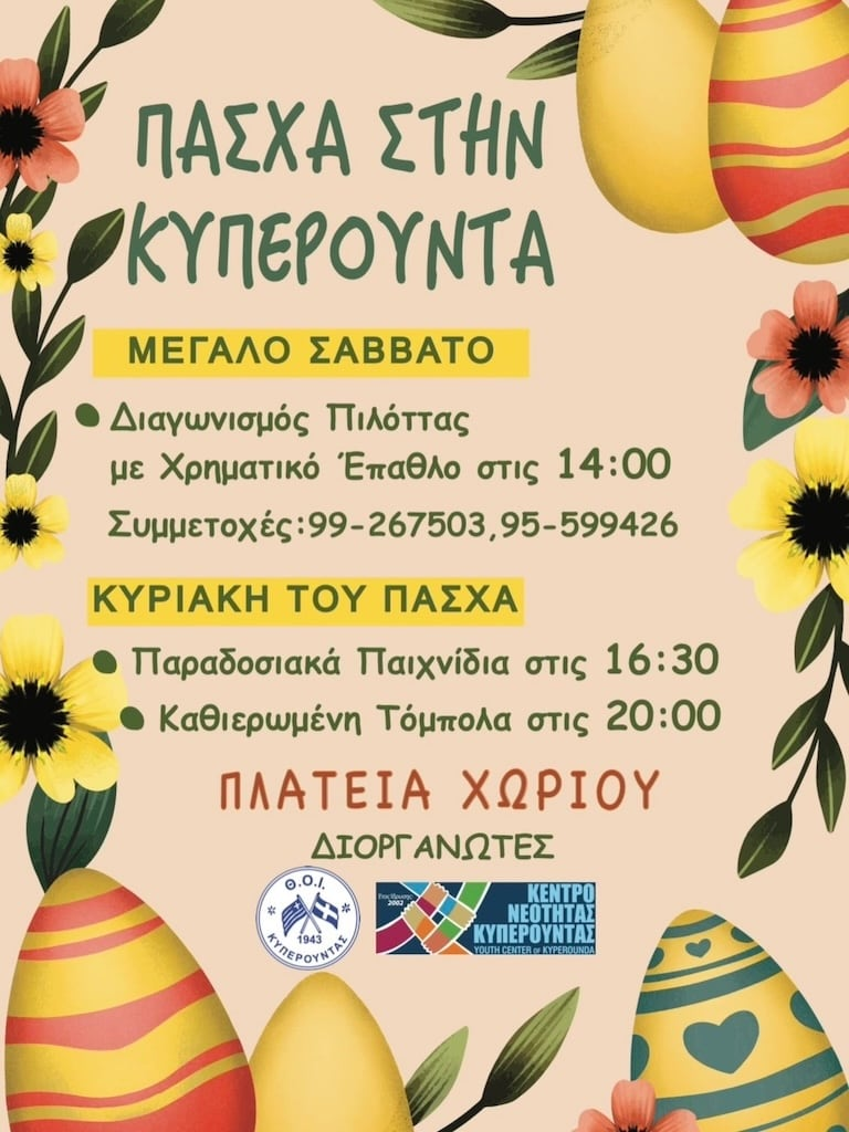 Μεγάλο ΣάββατοΔιαγωνισμός Πιλόττας με χρηματικό έπαθλο | 14:00Δηλώσεις συμμετοχής: 99-267503, 95-599426